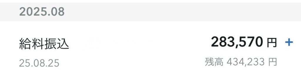 先月口座に振り込まれた給与です。毎月一定でこの金額になります。税引き前の総支給で言うと350,000円くらいです。20代低学歴の私にしては十分もらえていると思っています。
