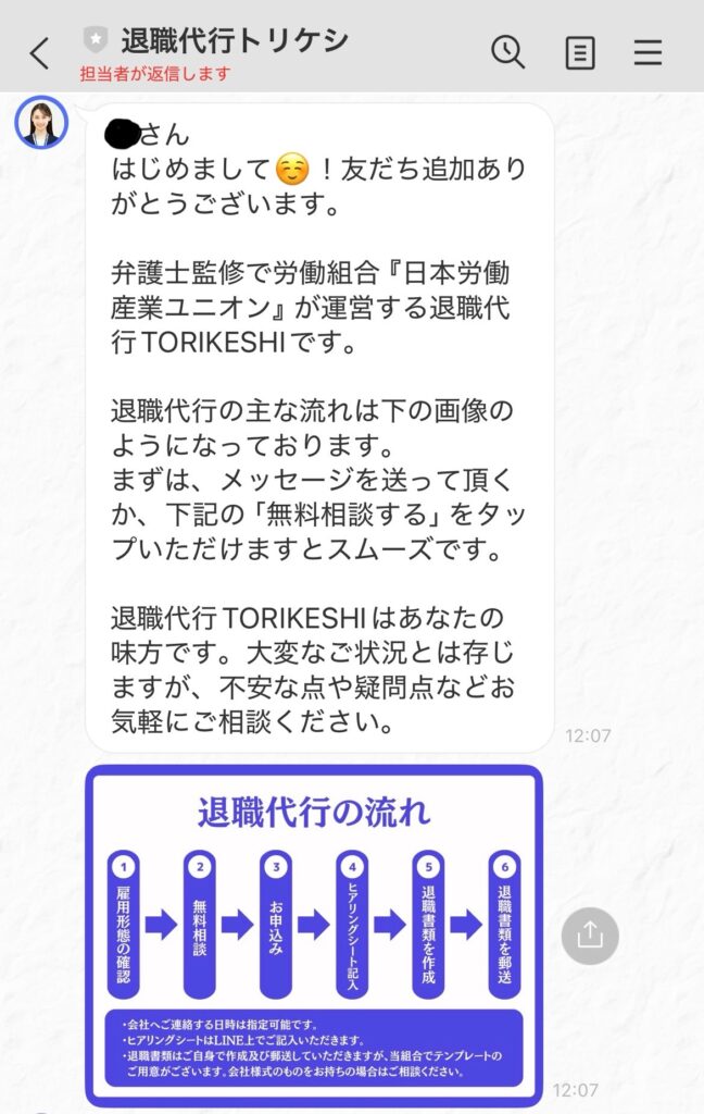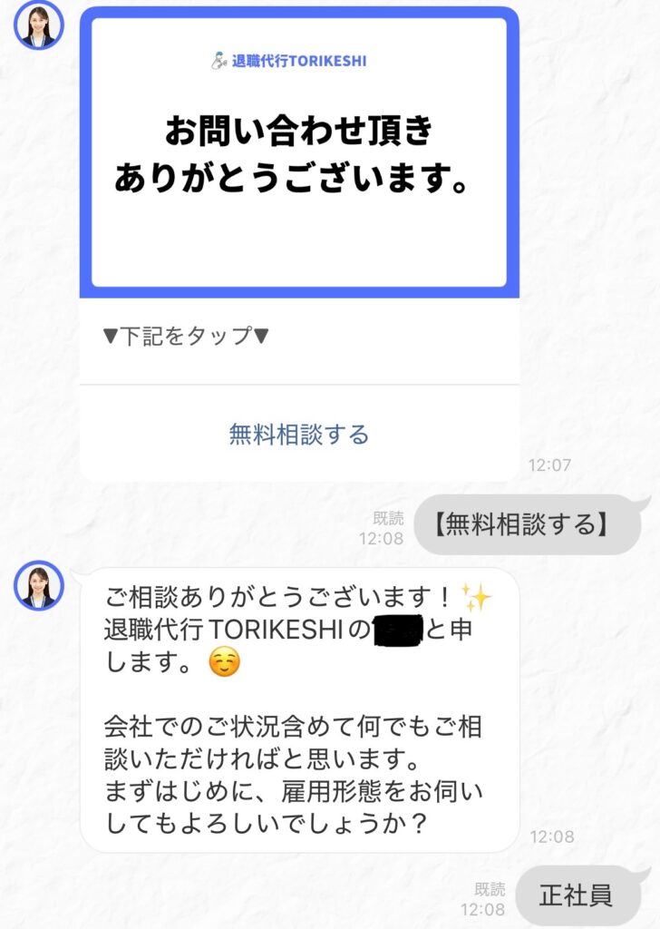 退職代行トリケシを使った感想は、「LINEで完結するので楽」「無料相談ができるので、不安を解消した上で申し込める。」という点が良かったと思います。