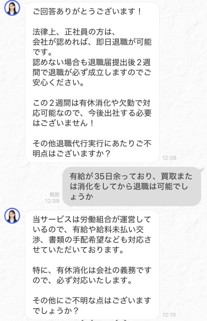 退職代行とのトラブルもありませんでした。小さな行き違いのようなものはありましたが、やり取りを進める中で解消されました。何か疑問に思うことがあれば、相談をすれば問題なく進むと思います。