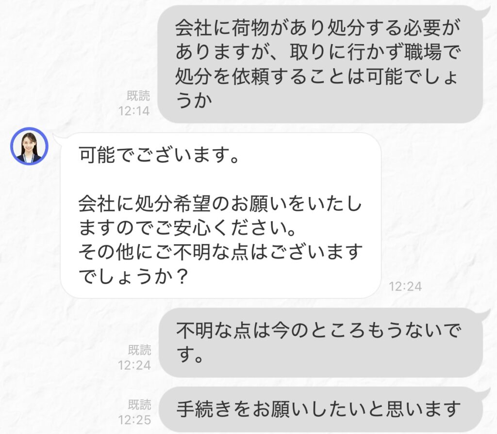 上記の書類準備と並行して、依頼した時間帯に会社へ退職の連絡してもらいました。無料相談から退職の連絡まで2時間半で進みました。私の返信が遅くなければもっと早く進んでいた可能性もありますし、依頼すれば早く連絡をしてもらえる可能性もありそうです。