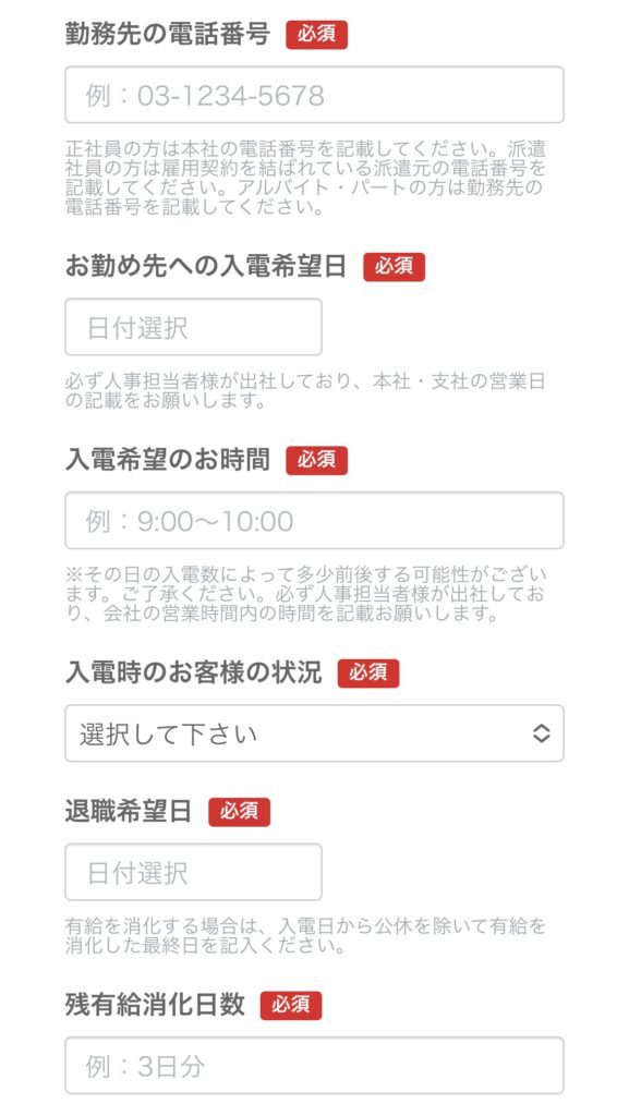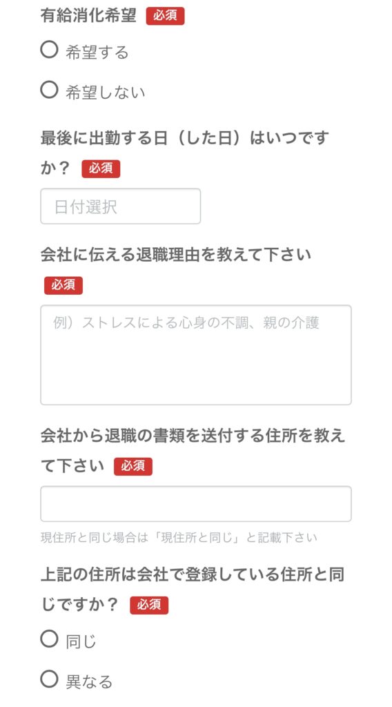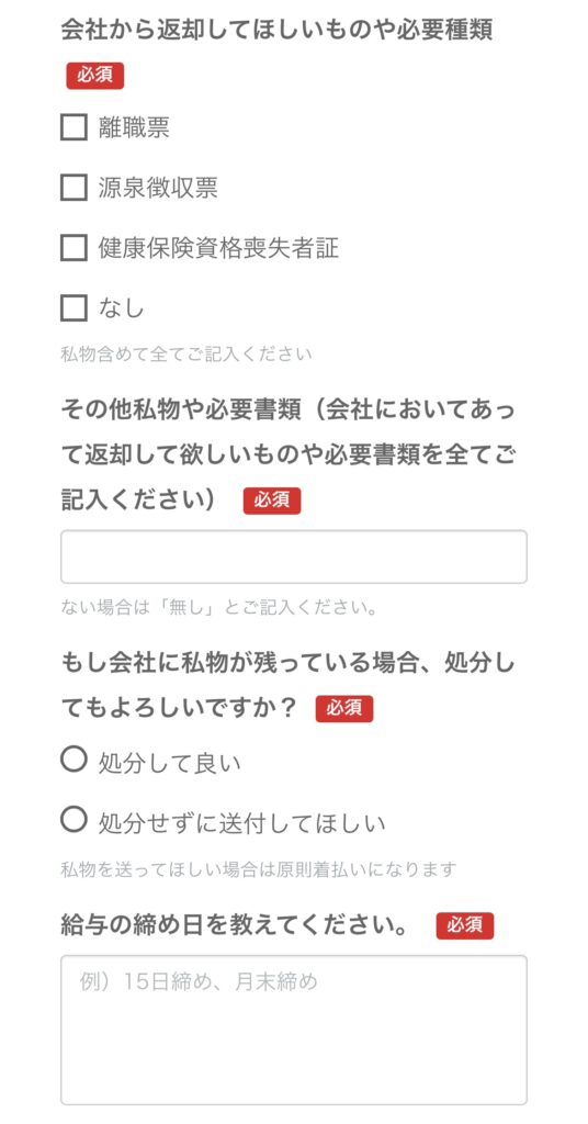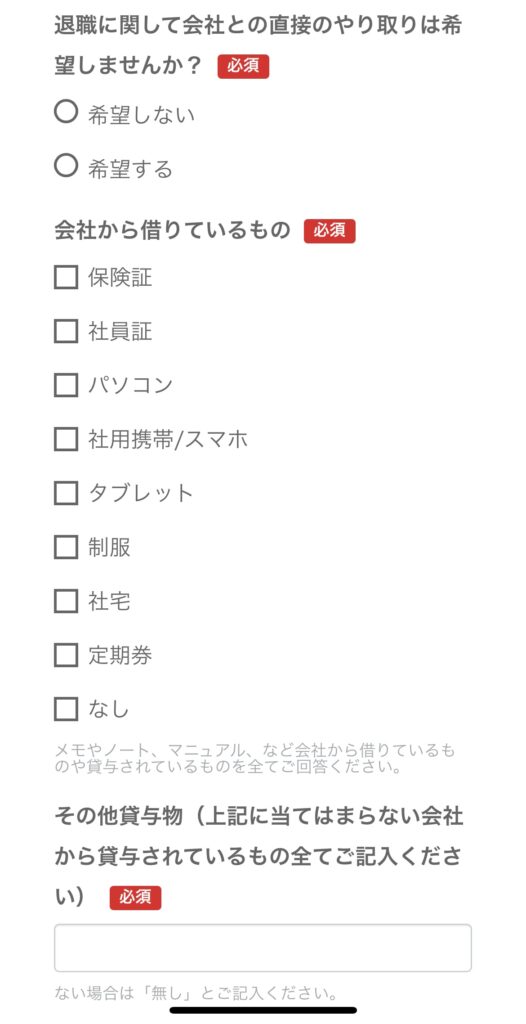 個人情報や、退職する会社の情報を記入します。私物や会社からの貸与物についての項目もあり、事前に情報共有をすることでスムーズに退職できたと感じています。