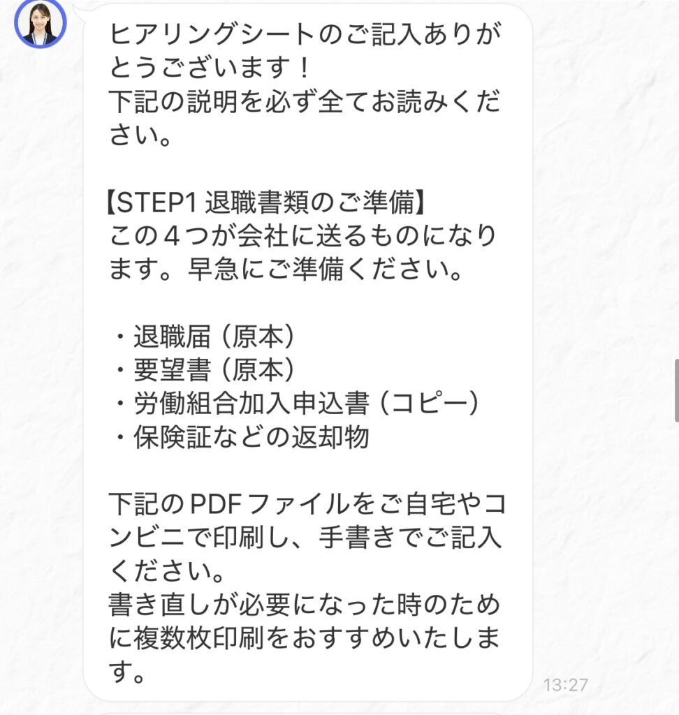 退職に必要な書類をLINEで案内してもらえます。新たに作成が必要な書類についてはPDFファイルをつけてもらえるため、1から書類を作成する必要がありません。用紙を印刷して、記入例に沿って書き込むだけでOKです。また、書類に不備がないか確認もしてもらえました。記入が終わったら早急に会社へ郵送して、完了です。